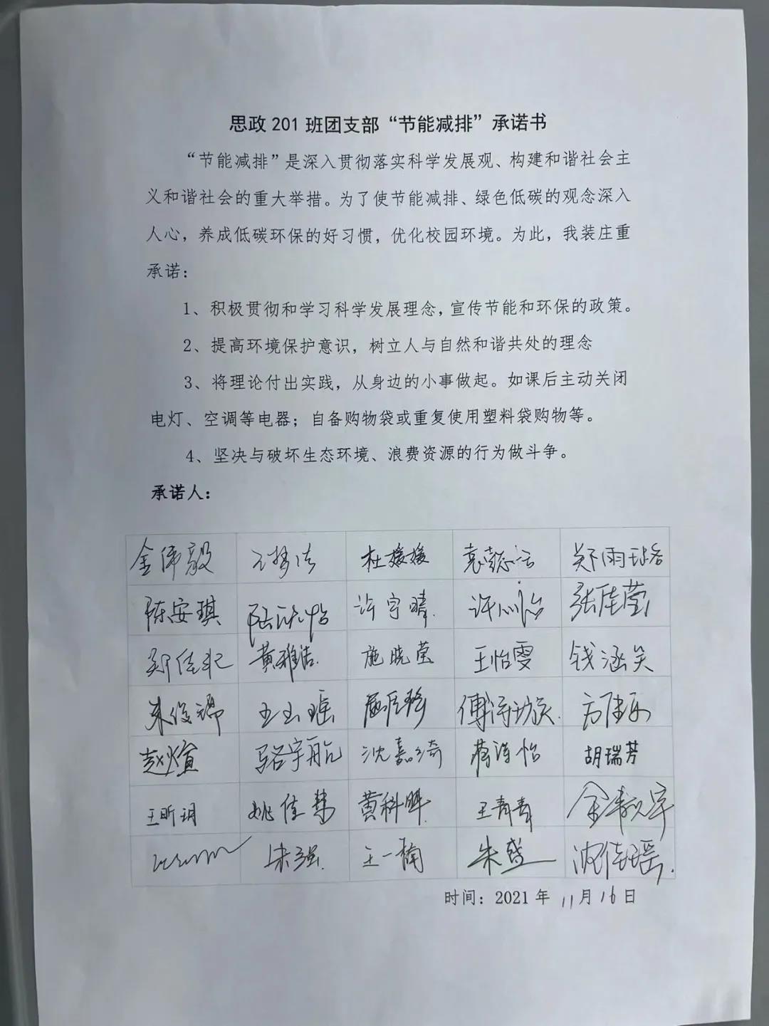 其次,团支部开展了节能从我做起”——承诺书签名活动,通过同学签名承诺的方式,使同学们树立节能减排从小事做起意识。鼓励同学们在日常生活中通过课后主动关闭教室电器、自备购物袋或重复使用塑料袋购物等途径,参与到节能减排之中。本次承诺书签名活动,团支部全体成员参与,取得了良好的效果。