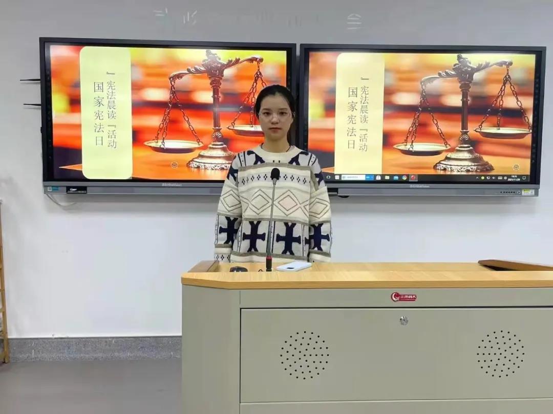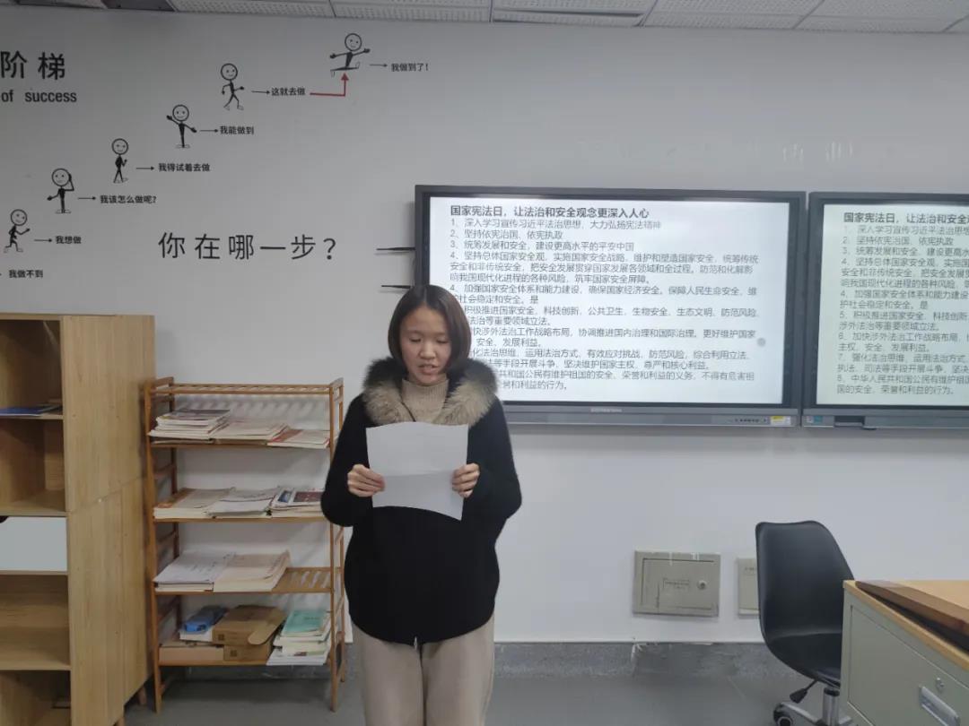 此外,团支部还组织了朗读环节,让法治和安全更深入人心。同学们纷纷踊跃参加,争做国家宪法日的宣扬者,新时代推进全面依法治国,必须进一步加强宪法实施和监督,贯彻落实党的十九届四中全会做出的决策部署,而作为当代青年,我们每个人都应该为宪法的实施出一份力!
